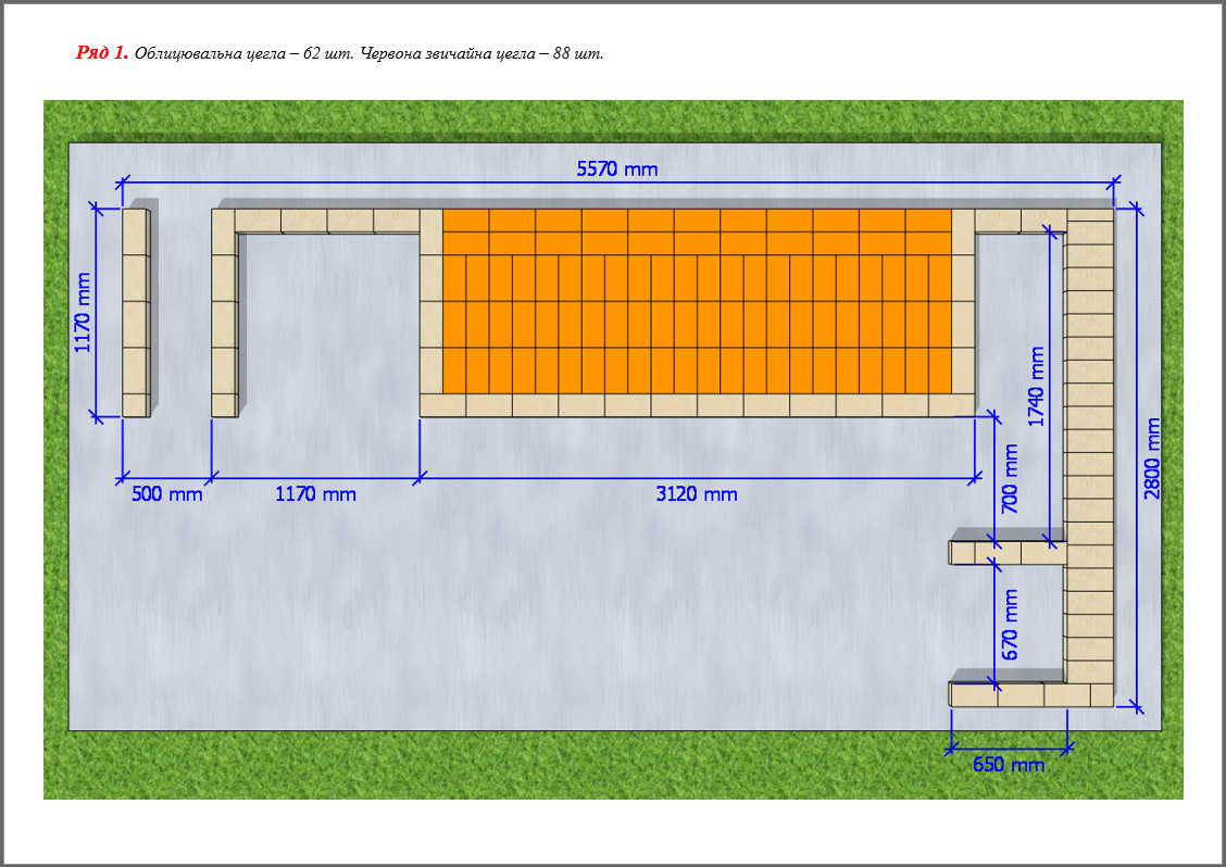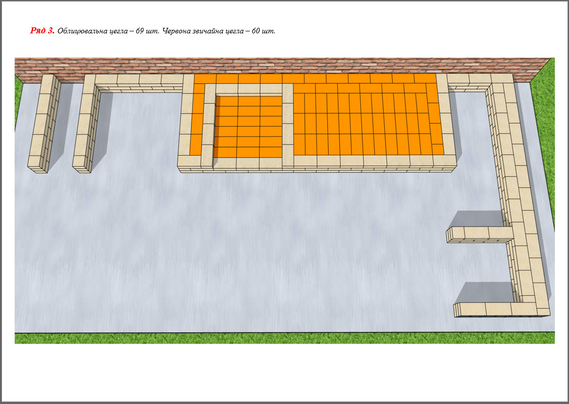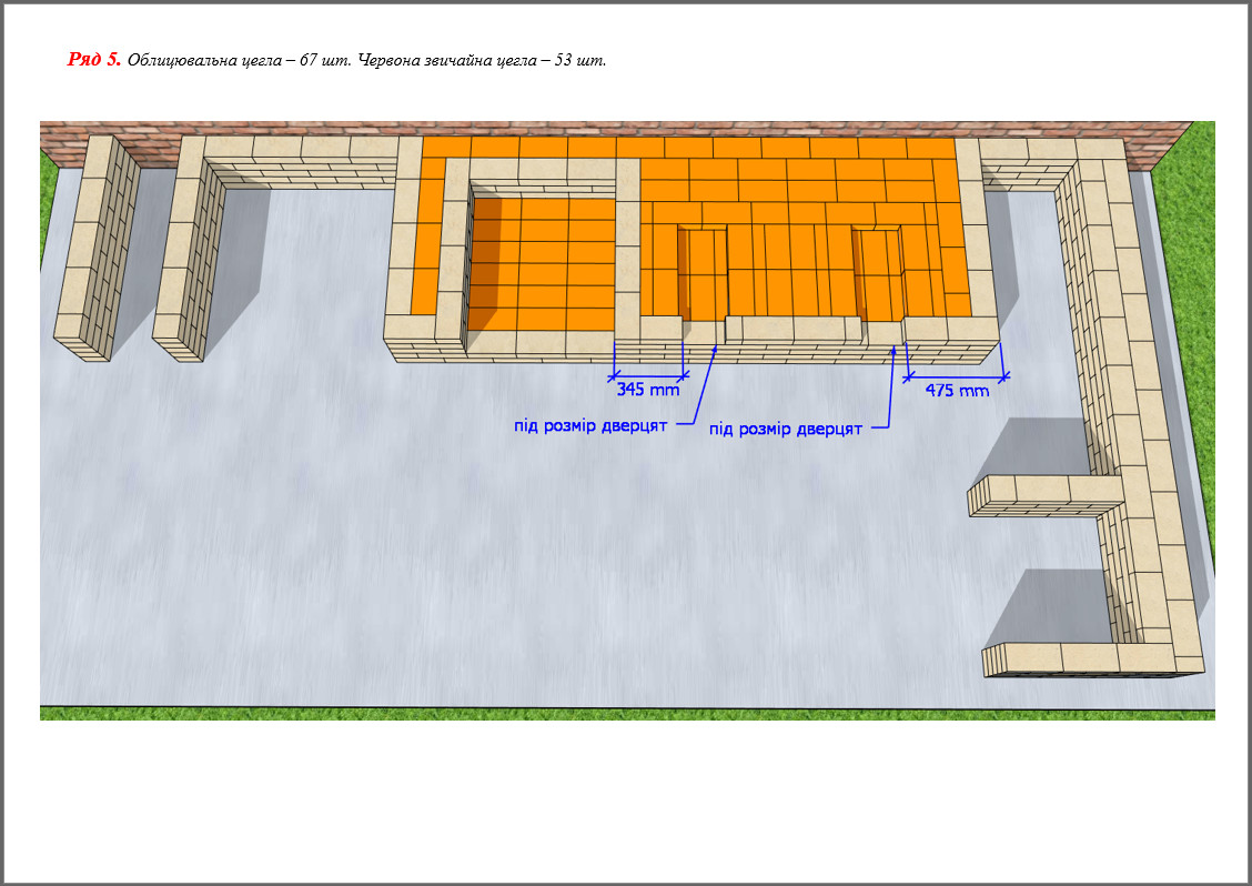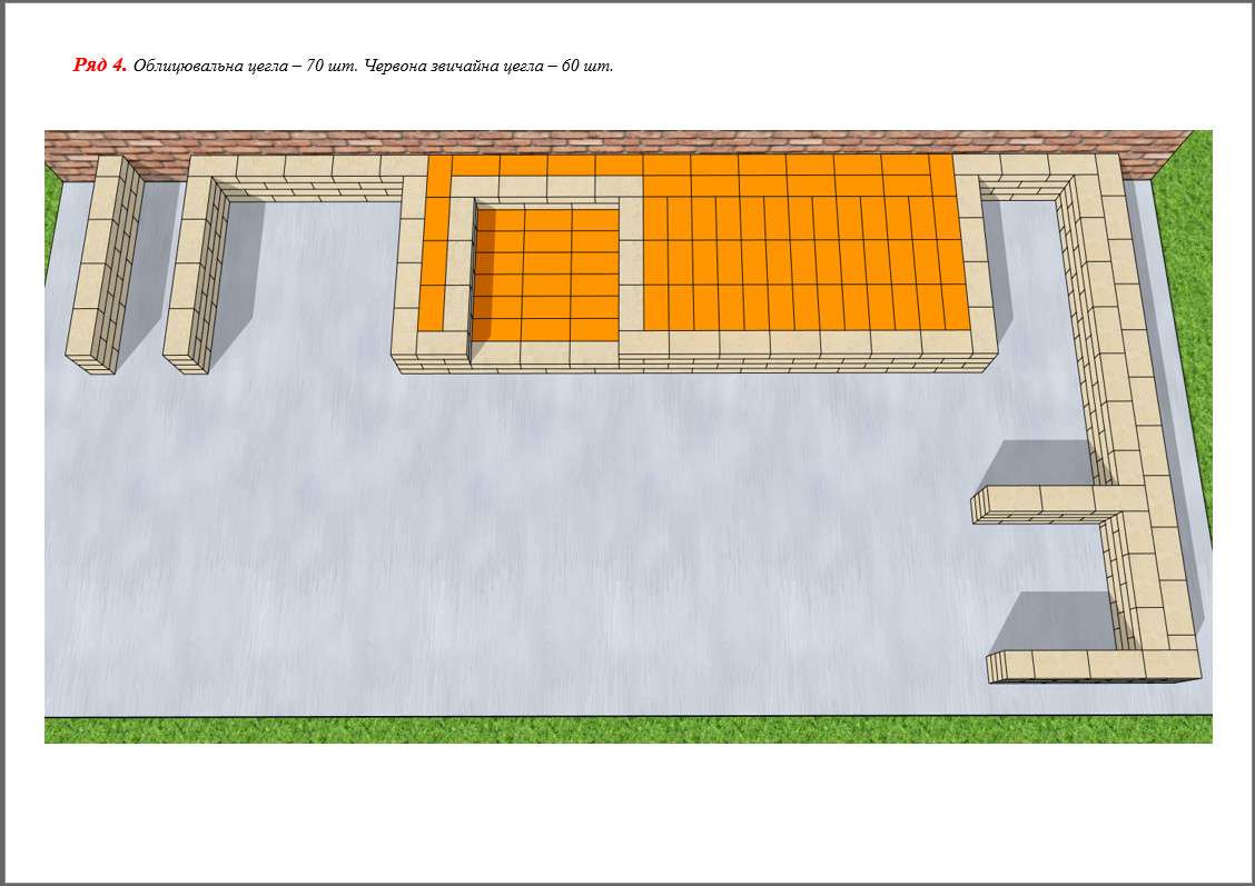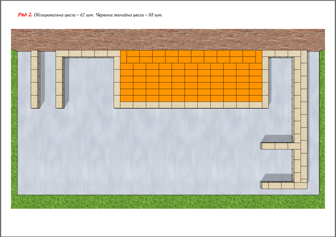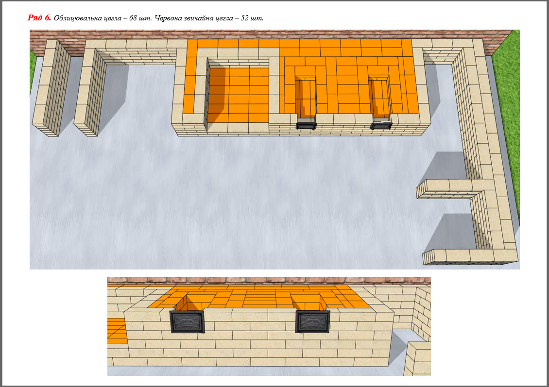 Перед кладкою даного комплексу кладеться ізолююча плівка. Використовується вогнетривка, облицювальна та звичайна цегла розміром 250*120*65 мм.
