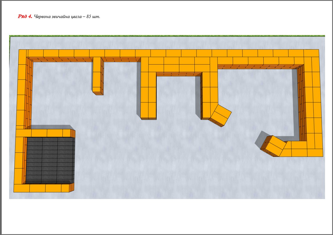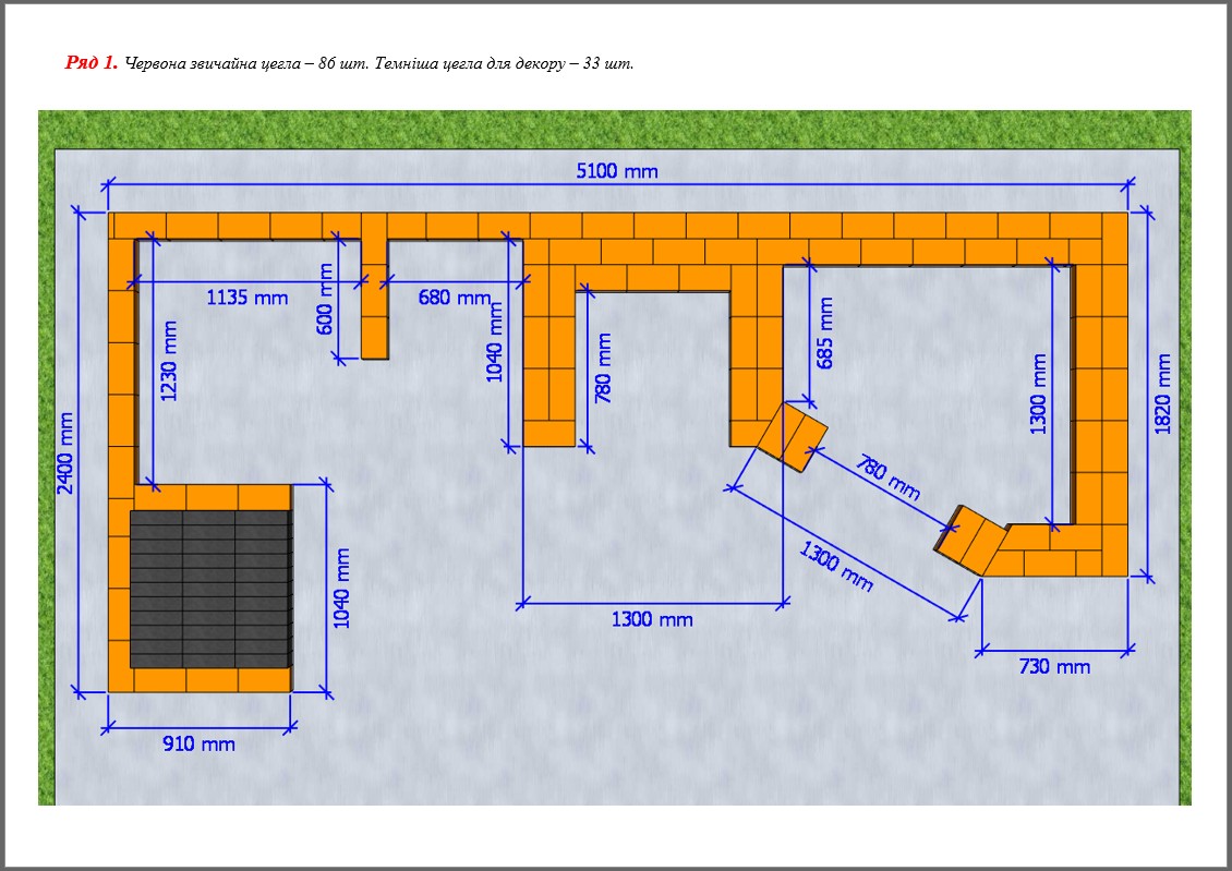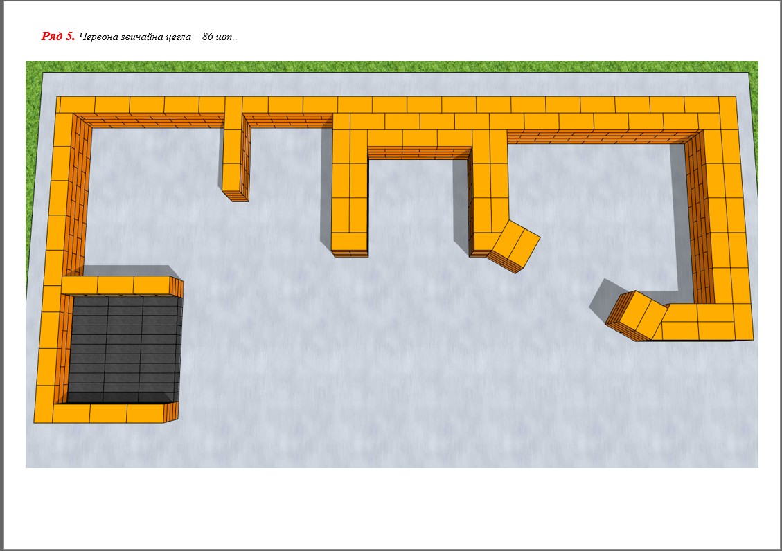 Перед кладкою даного комплексу кладеться ізолююча плівка. Використовується вогнетривка, облицювальна та звичайна цегла розміром 250*120*65 мм.