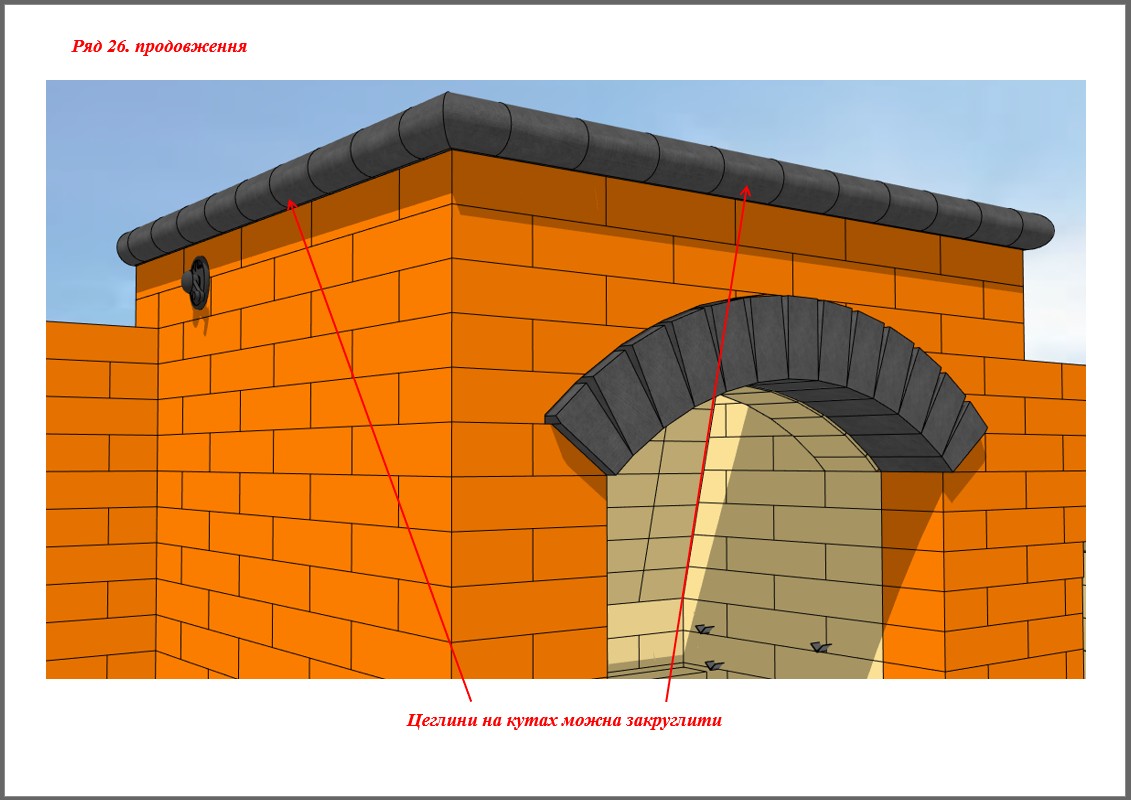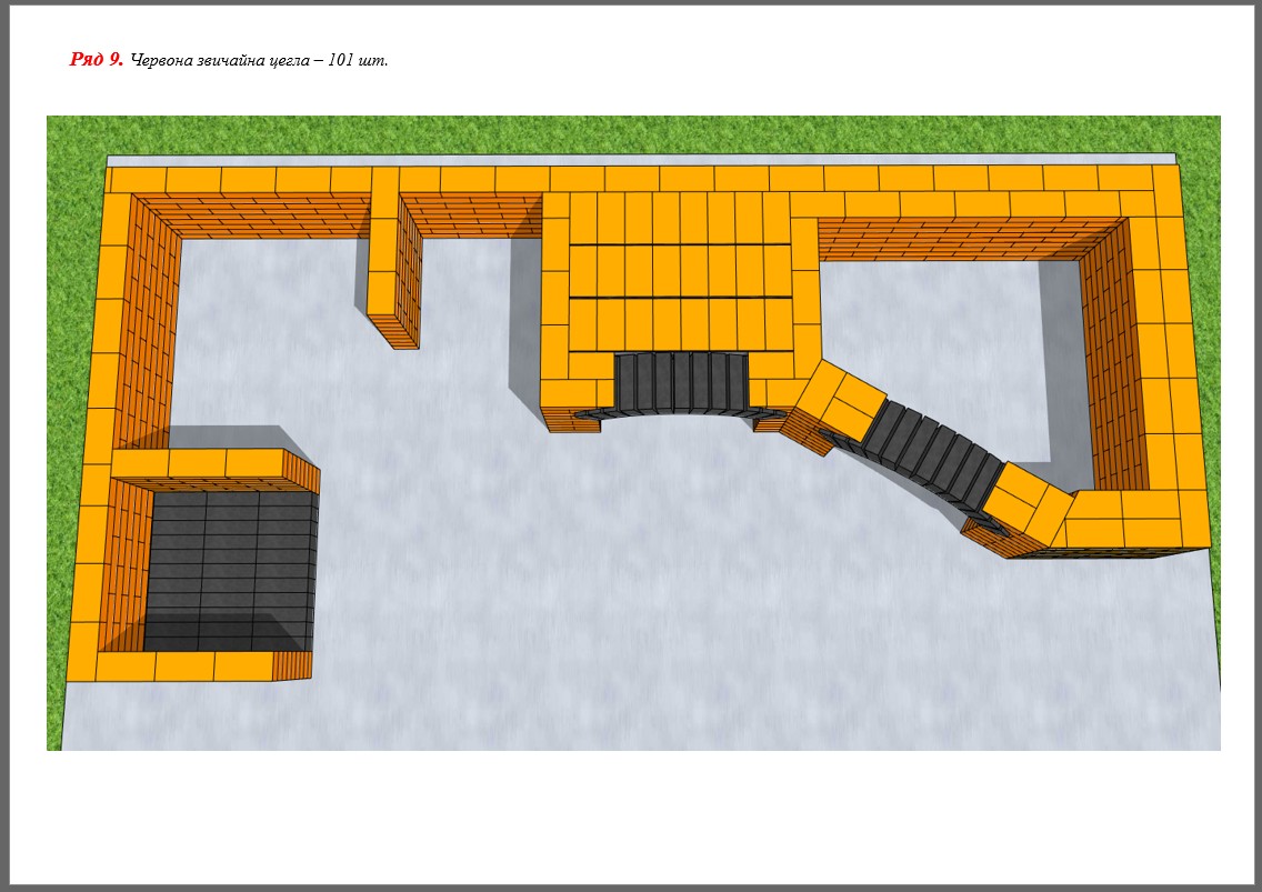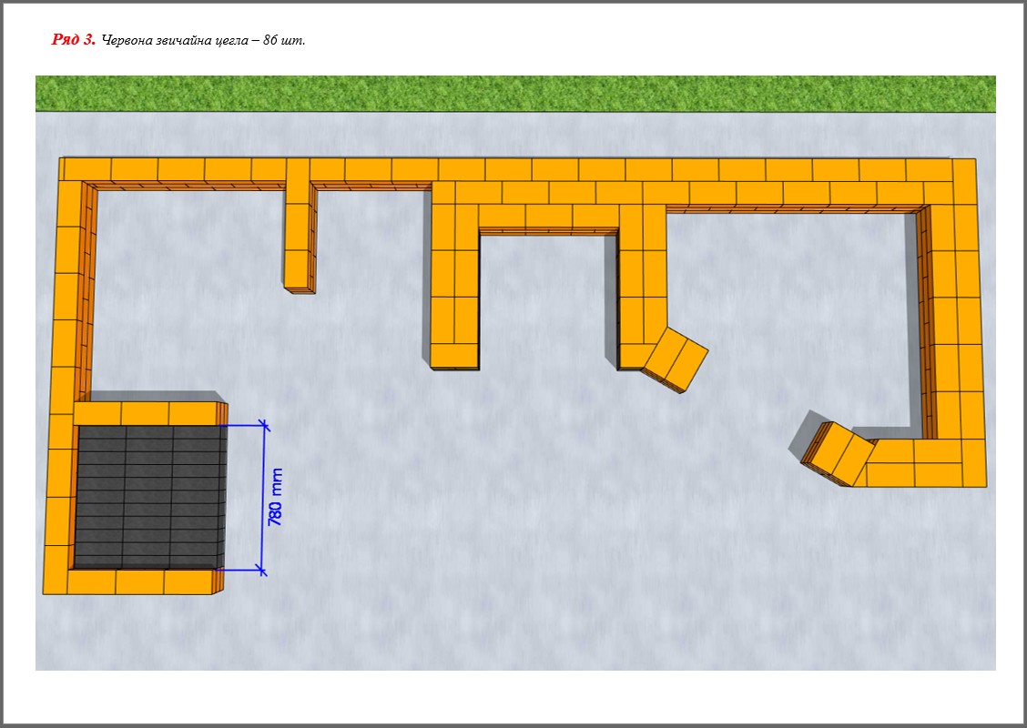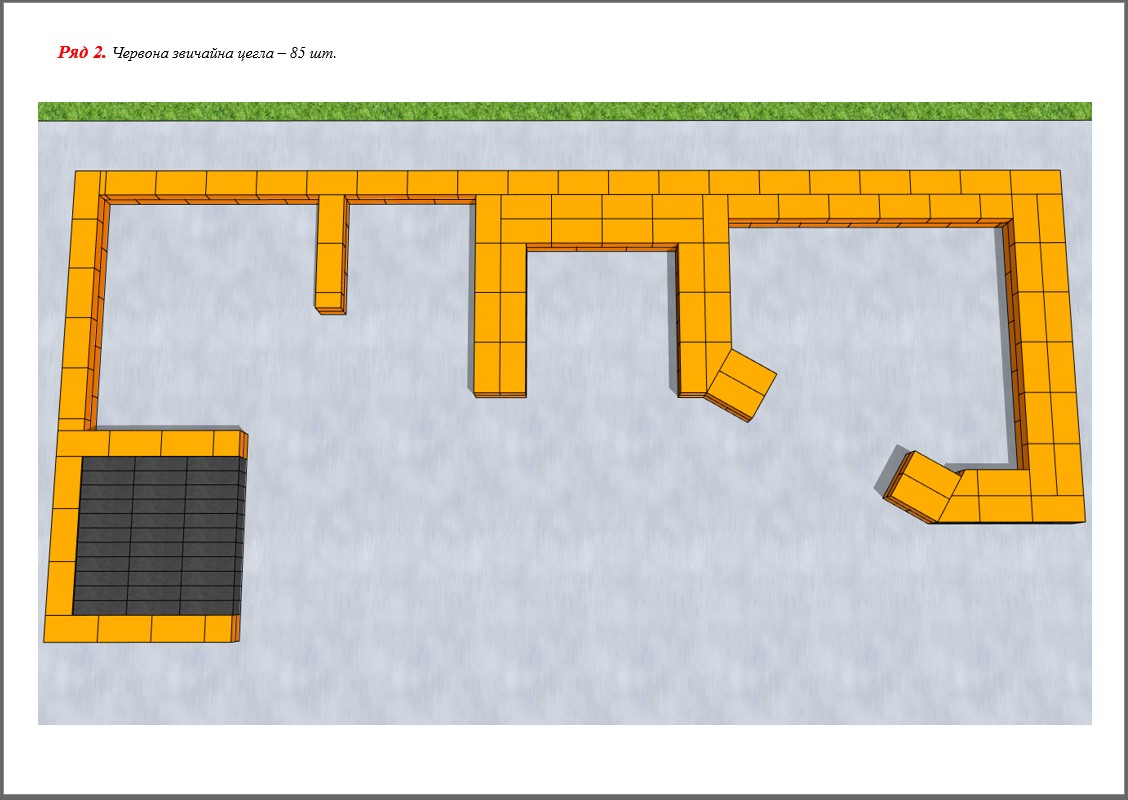 Перед кладкою даного комплексу кладеться ізолююча плівка. Використовується вогнетривка, облицювальна та звичайна цегла розміром 250*120*65 мм.