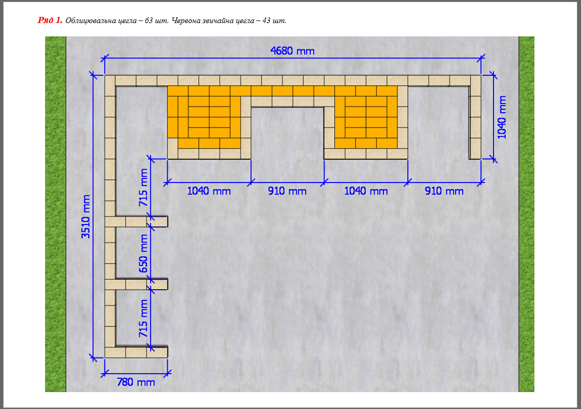 - 723 шт. (+20 на брак) – червона звичайна цегла;
