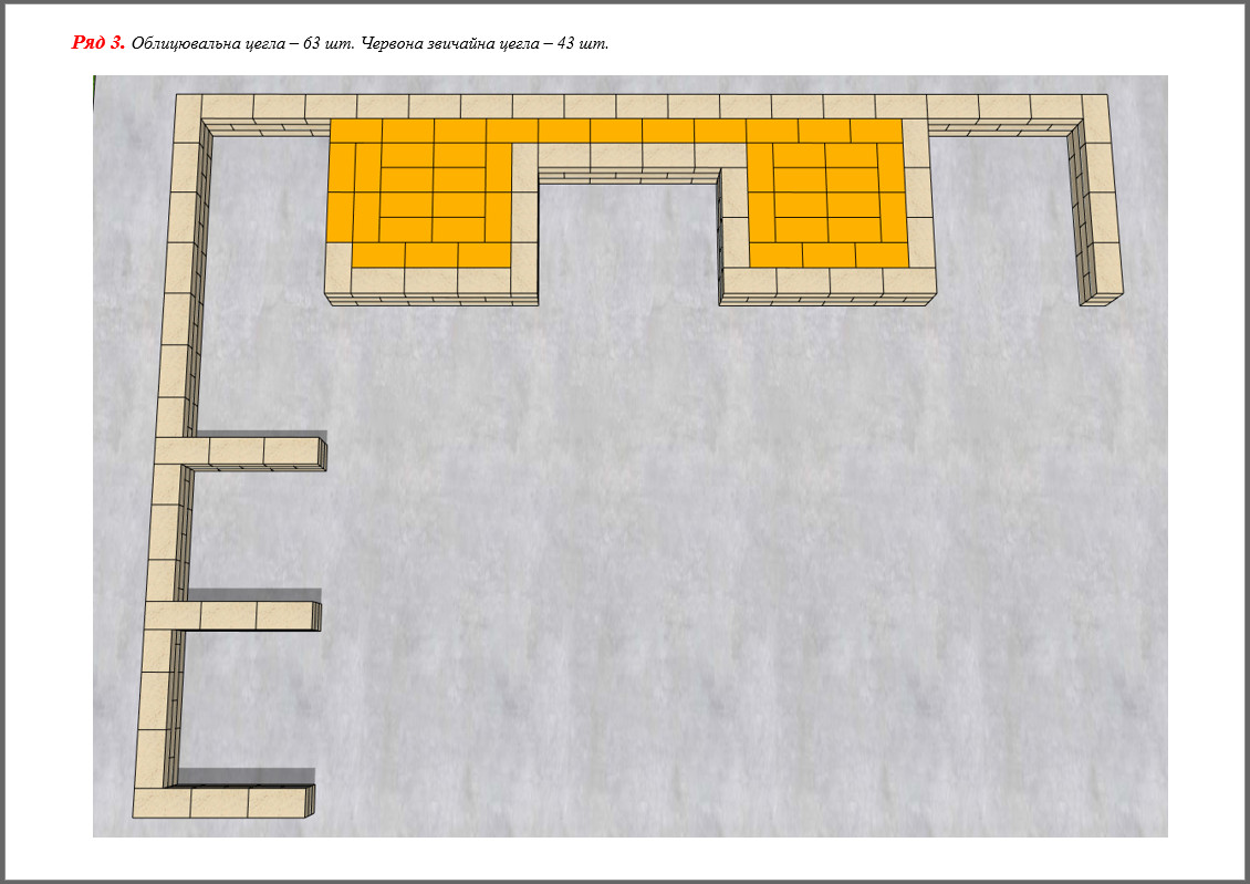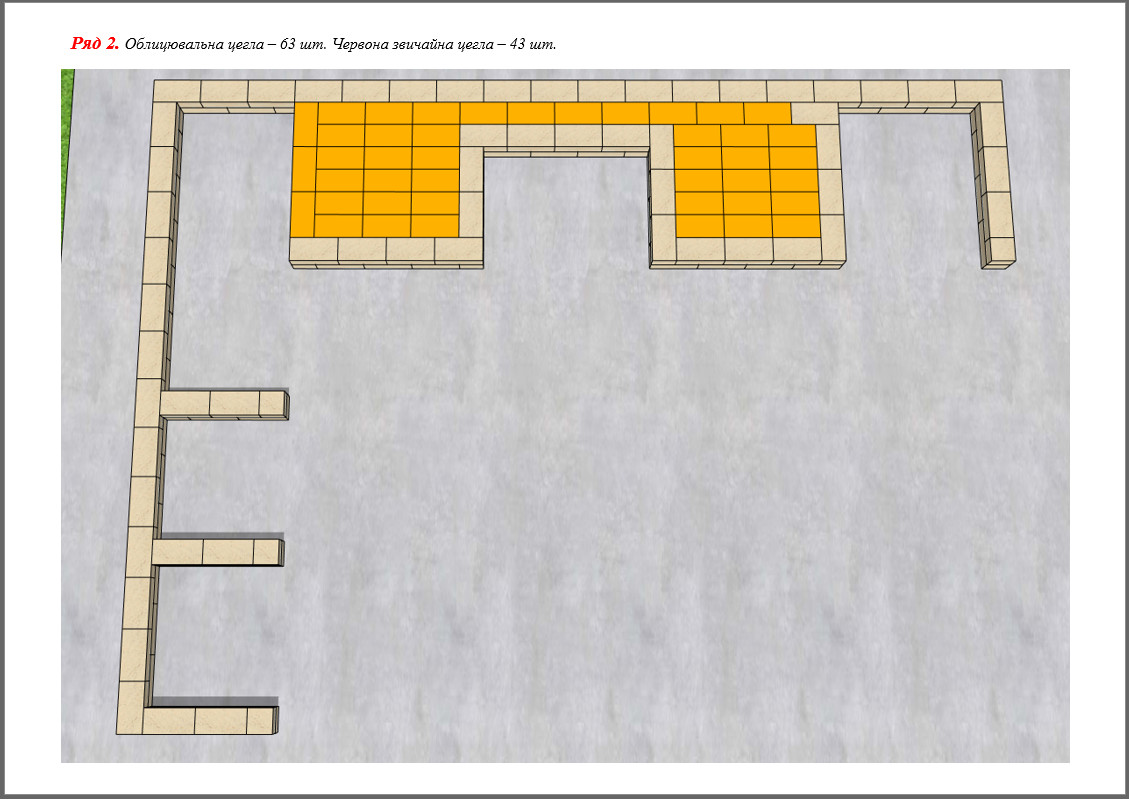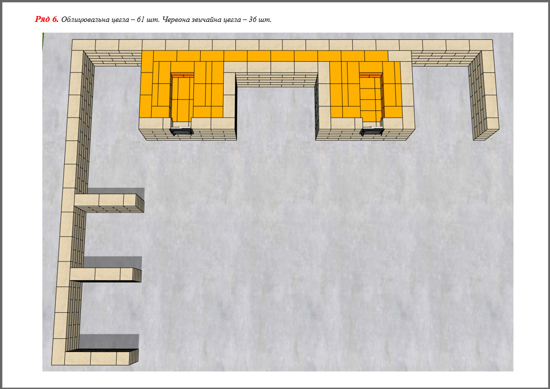 Перед кладкою даного комплексу кладеться ізолююча плівка. Використовується вогнетривка (230*114*65 мм), облицювальна (250*100*65 мм) та червона цегла розміром 250*120*65 мм.
