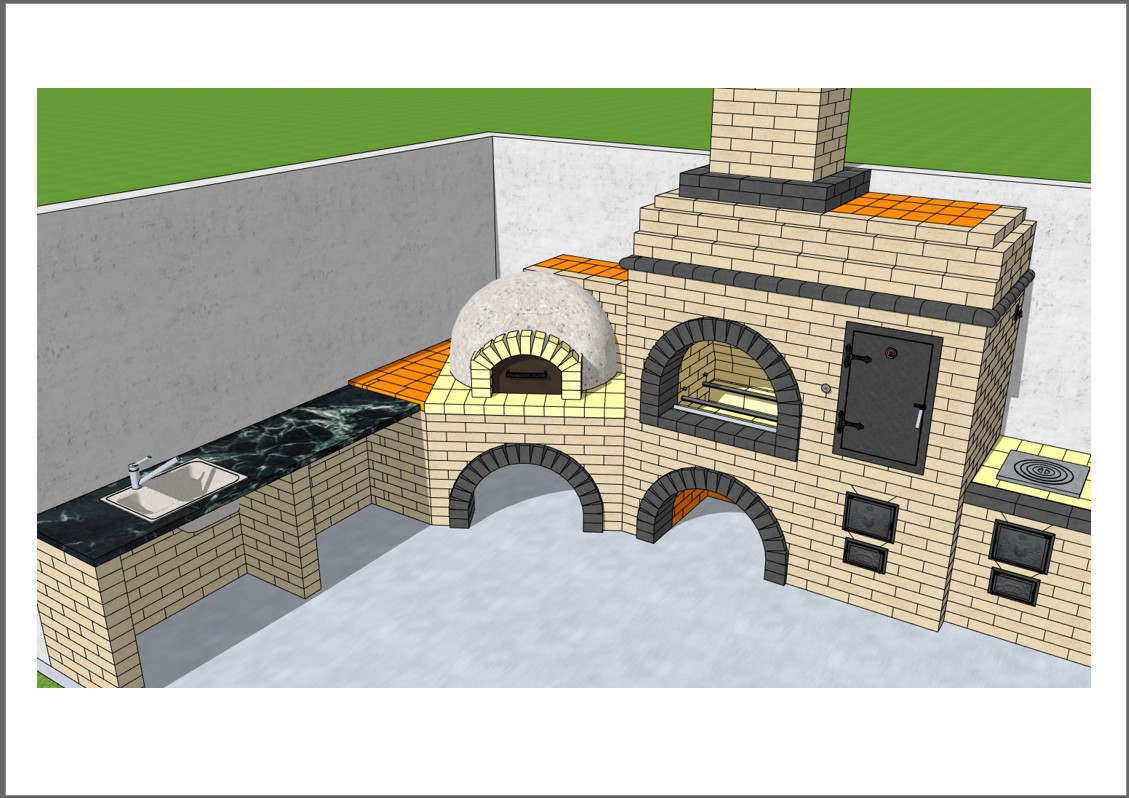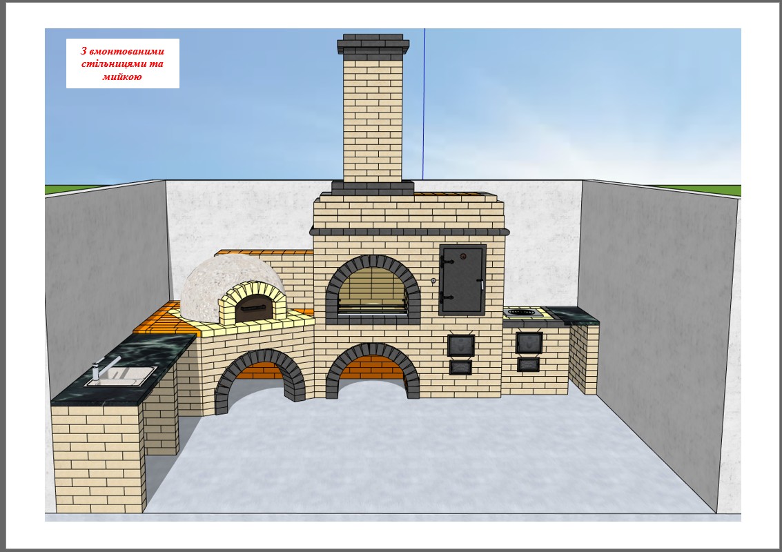 Проект налічує 136 сторінок. У проект входить: мангал, варильна поверхня, піч для піци, коптильня, мийка та стіл.