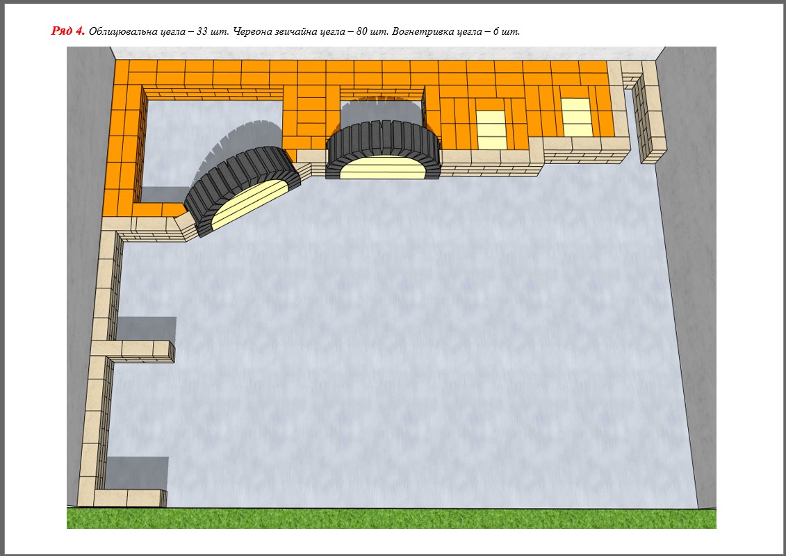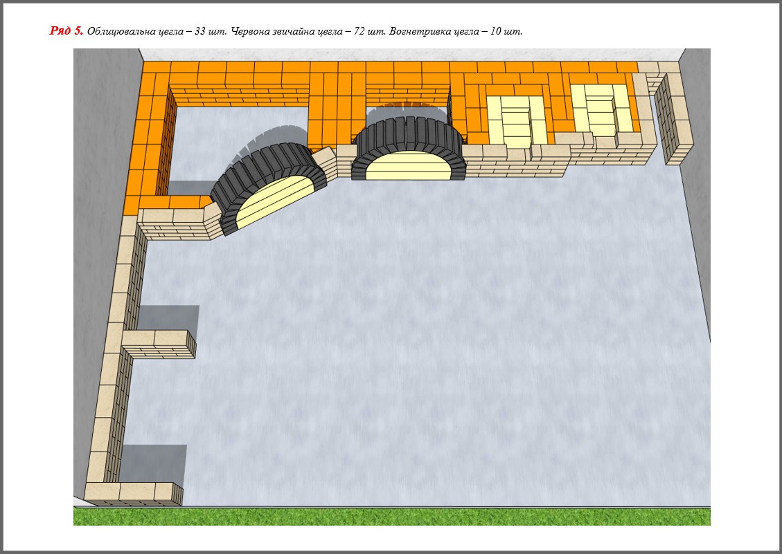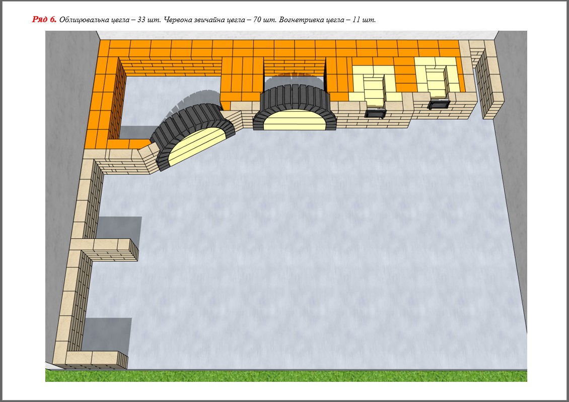 Перед кладкою даного комплексу кладеться ізолююча плівка. Використовується вогнетривка, облицювальна та звичайна цегла розміром 250*120*65 мм.