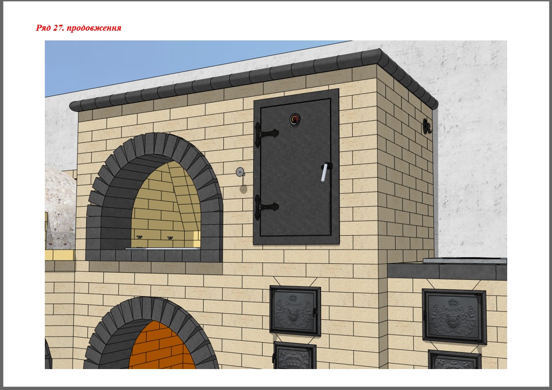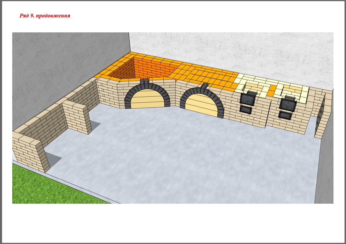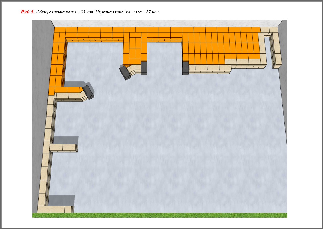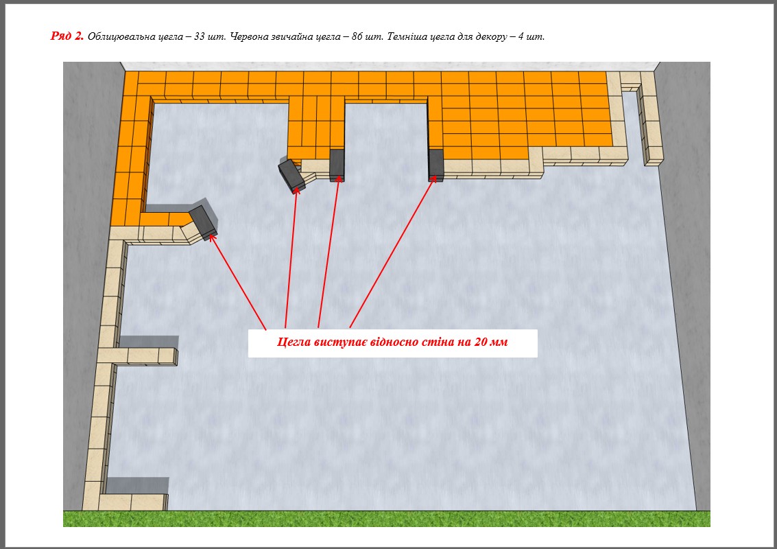 Перед кладкою даного комплексу кладеться ізолююча плівка. Використовується вогнетривка, облицювальна та звичайна цегла розміром 250*120*65 мм.