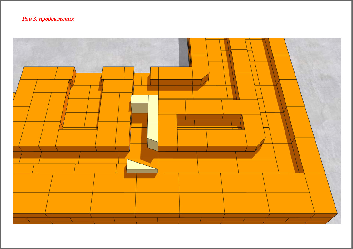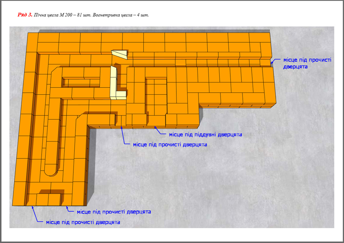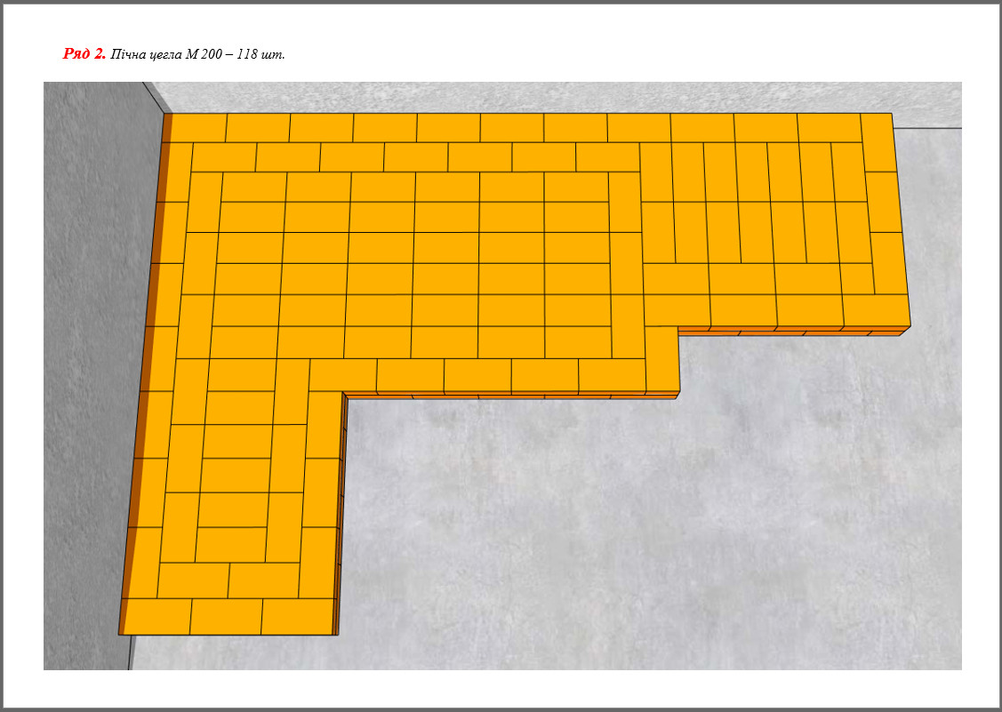 Перед кладкою даного комплексу кладеться ізолююча плівка. Використовується вогнетривка (230*114*65 мм), облицювальна (250*100*65 мм) та червона цегла розміром 250*120*65 мм.