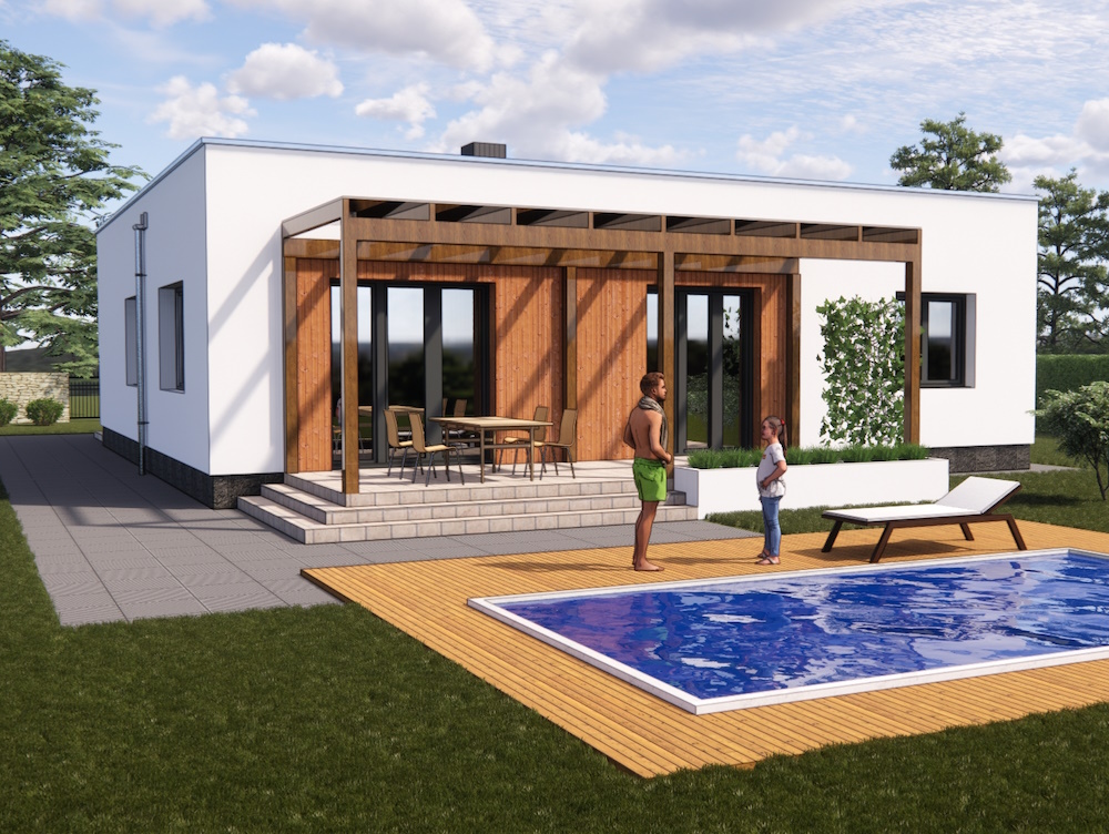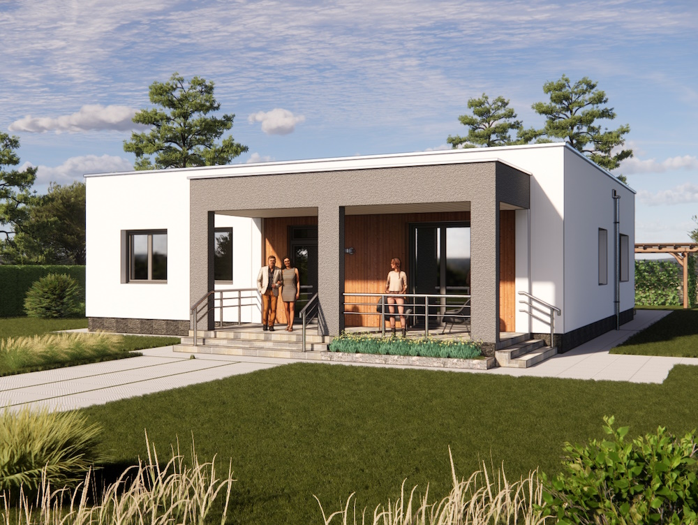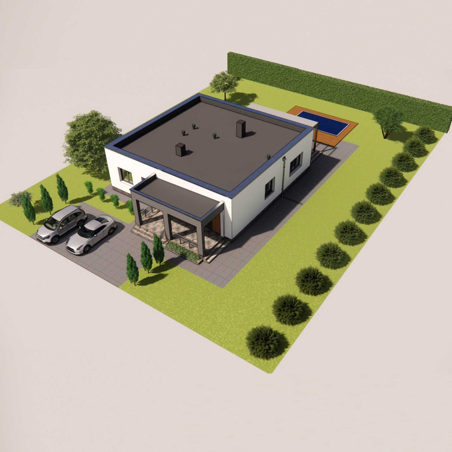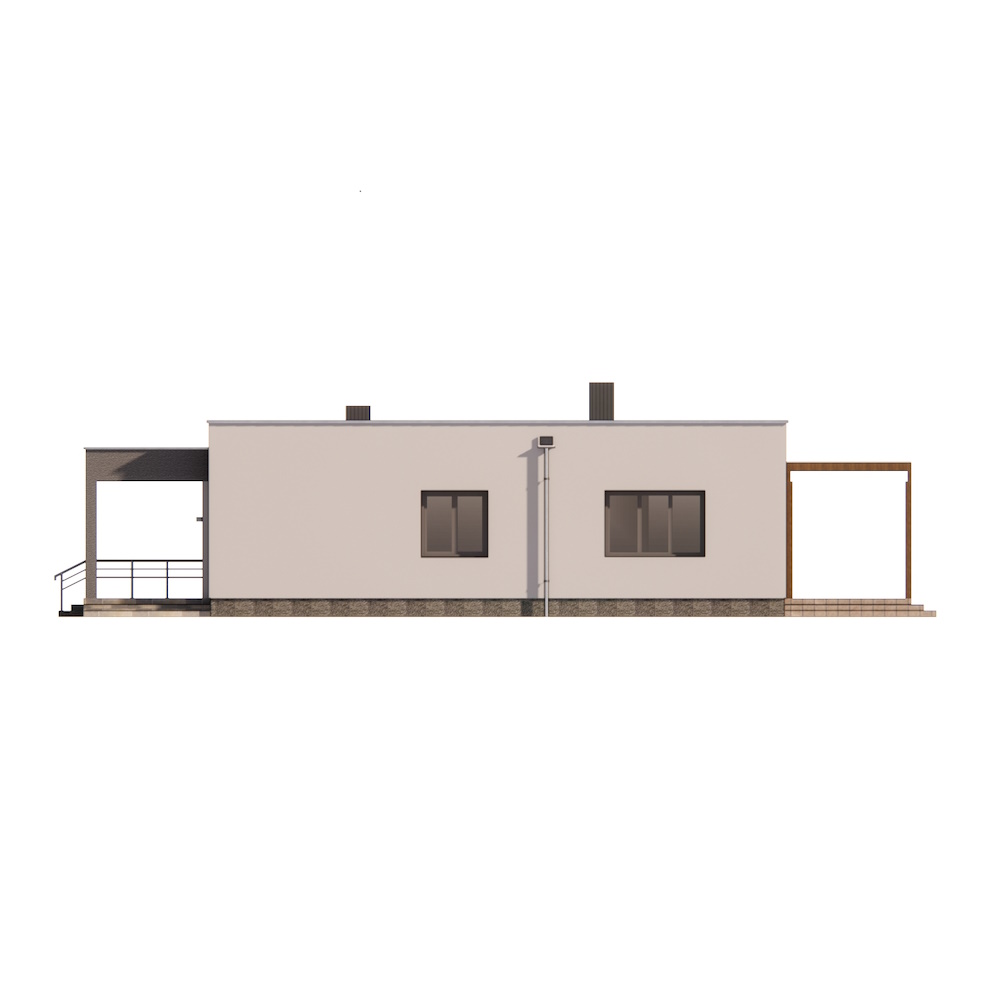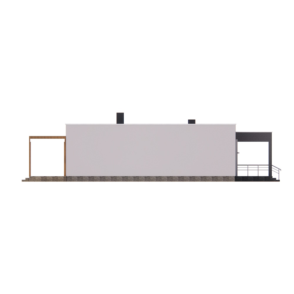 Проект “Герда 6” — це продуманий одноповерховий будинок, який поєднує комфортне та ізольоване приватне життя (три спальні та два санвузли) з великим спільним простором (43,6 м² кухня-вітальня). Його конструктивне рішення з плоскою покрівлею робить його економічно вигідним у будівництві та перспективним з погляду енергоефективності (завдяки можливості встановлення сонячних панелей). Відсутність горища та складної скатної системи значно здешевлює процес будівництва та зменшує кількість необхідних будівельних матеріалів і робіт. Геометричний, лаконічний фасад з плоскою покрівлею та акцентованими кольоровими вставками підкреслює сучасний архітектурний стиль.