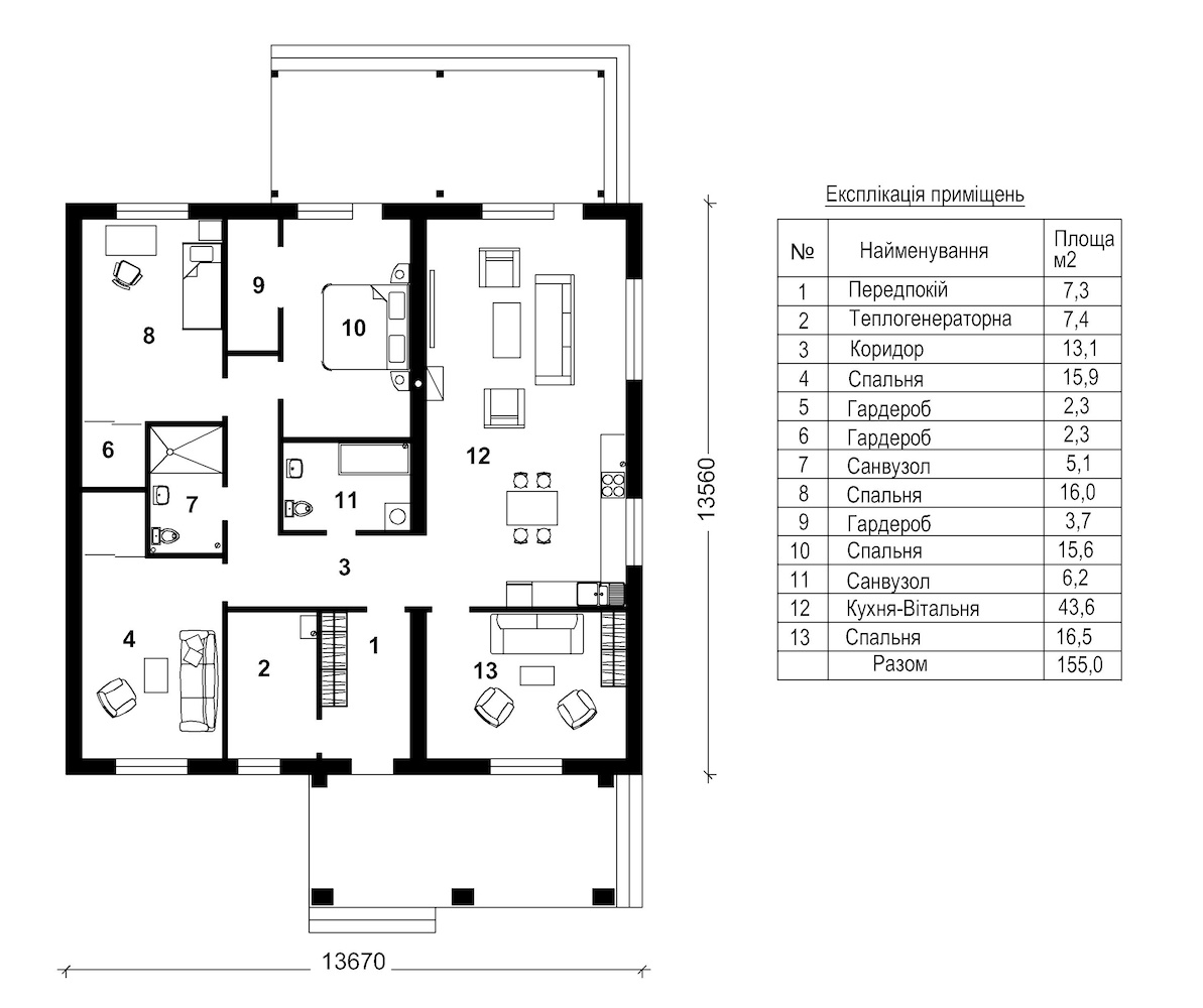 - Покрівельне покриття: наплавлювана полімерно-бітумна мембрана Сполімод.