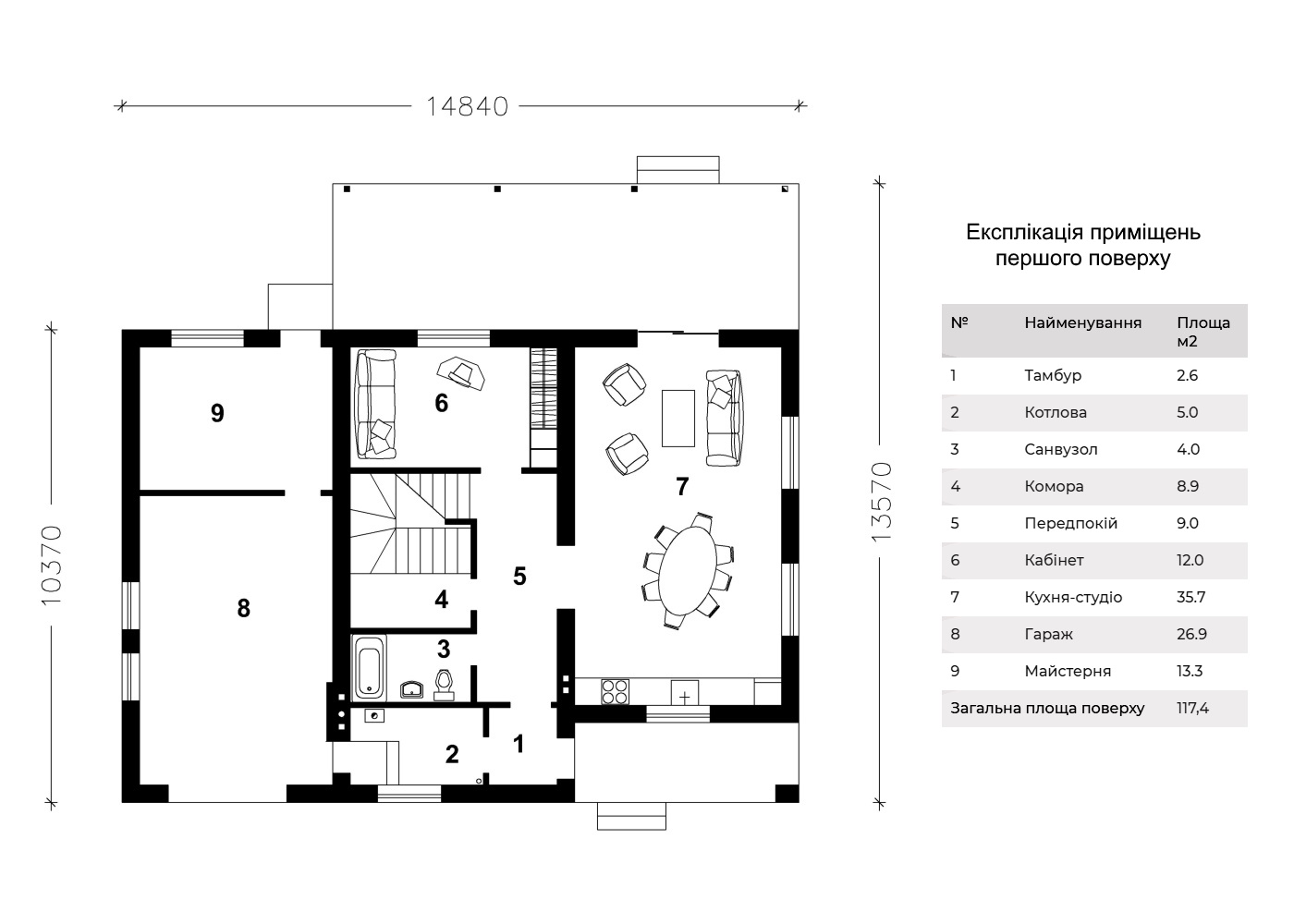 - Загальна площа без гаражу та підвалу: 168.1 м²,