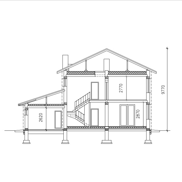 - Два розріза. На розрізах показана висота приміщень, віконних і дверних прорізів, підвіконь. Описаний склад перекриття між поверхами та підлоги.
