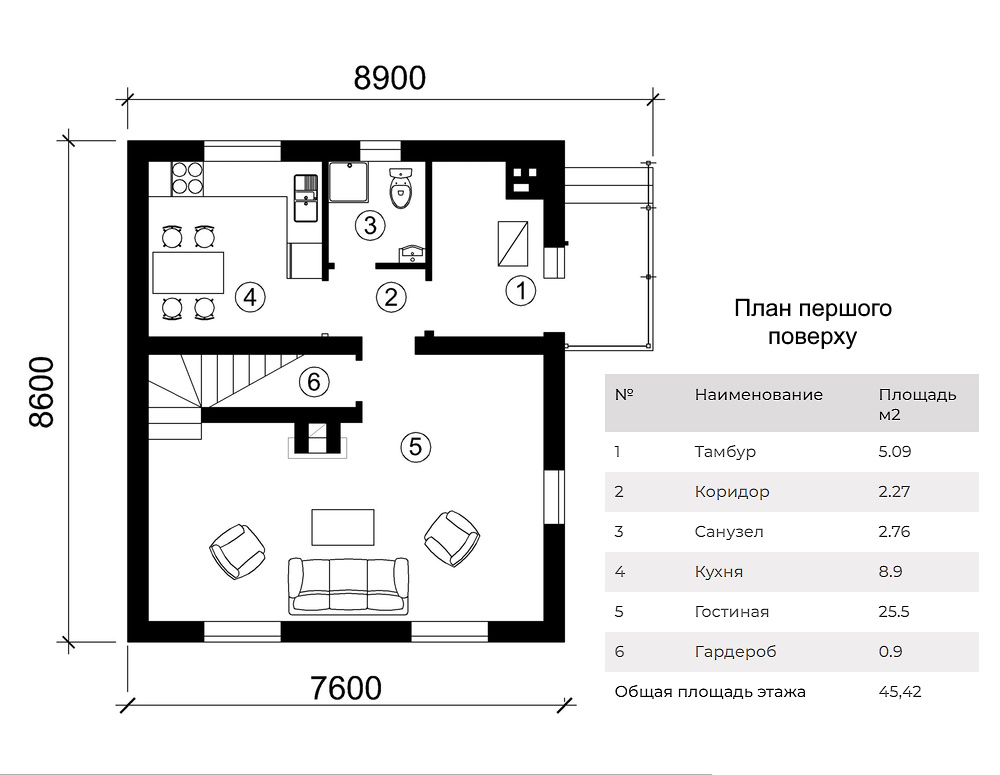 На першому поверсі знаходяться тамбур, суміщений санвузол, спальня або кабінет і кухня об’єднана з вітальнею. З кухні-їдальні ведуть сходи другий поверх. Під сходами передбачена комора.