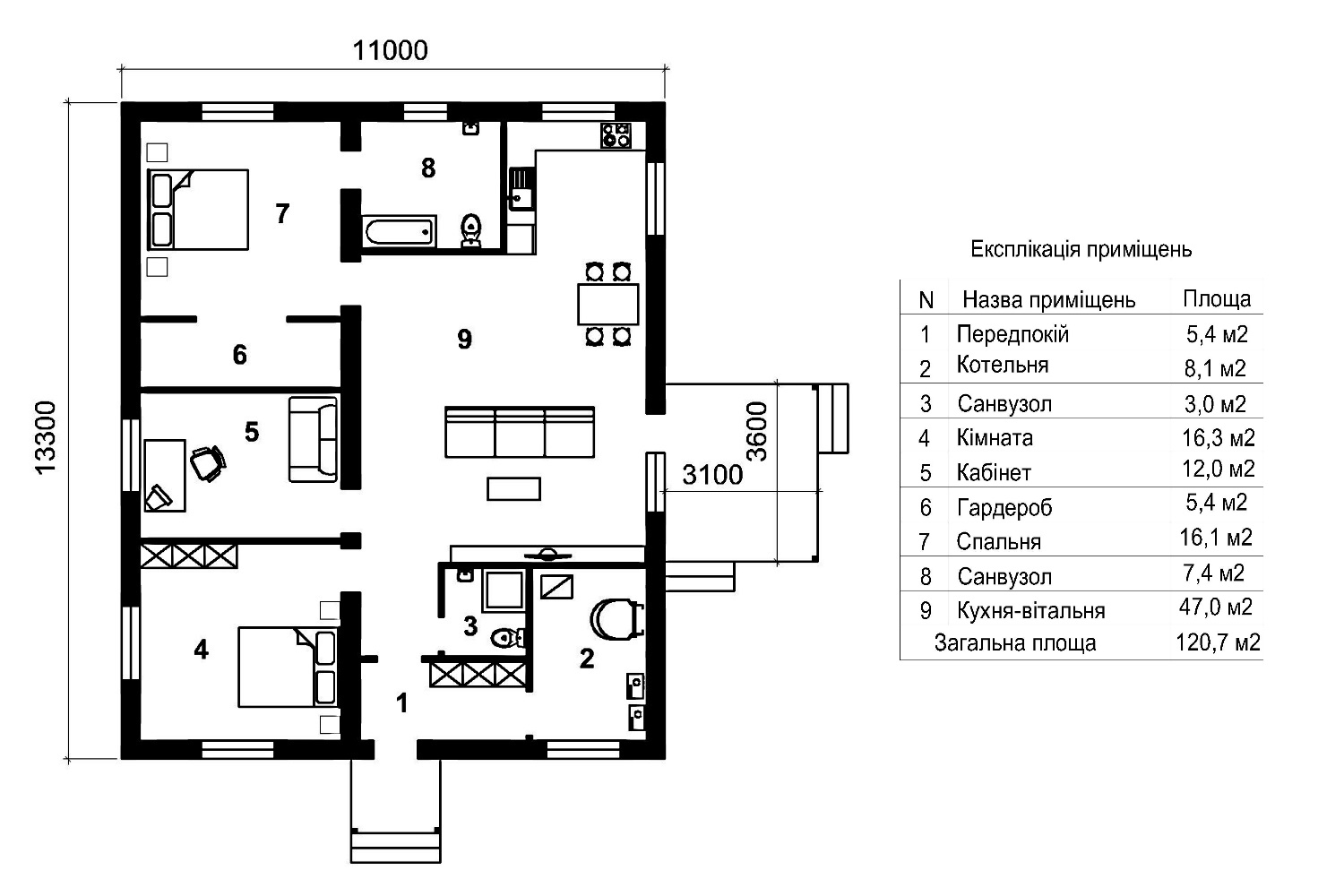 У котловій передбачена можливість встановлення газового та електричного котла або теплового насосу. До речі, тепловий насос – це електроприлад, що дозволяє значно зекономити витрати на опалення. Вхід до котельні з тамбура.
