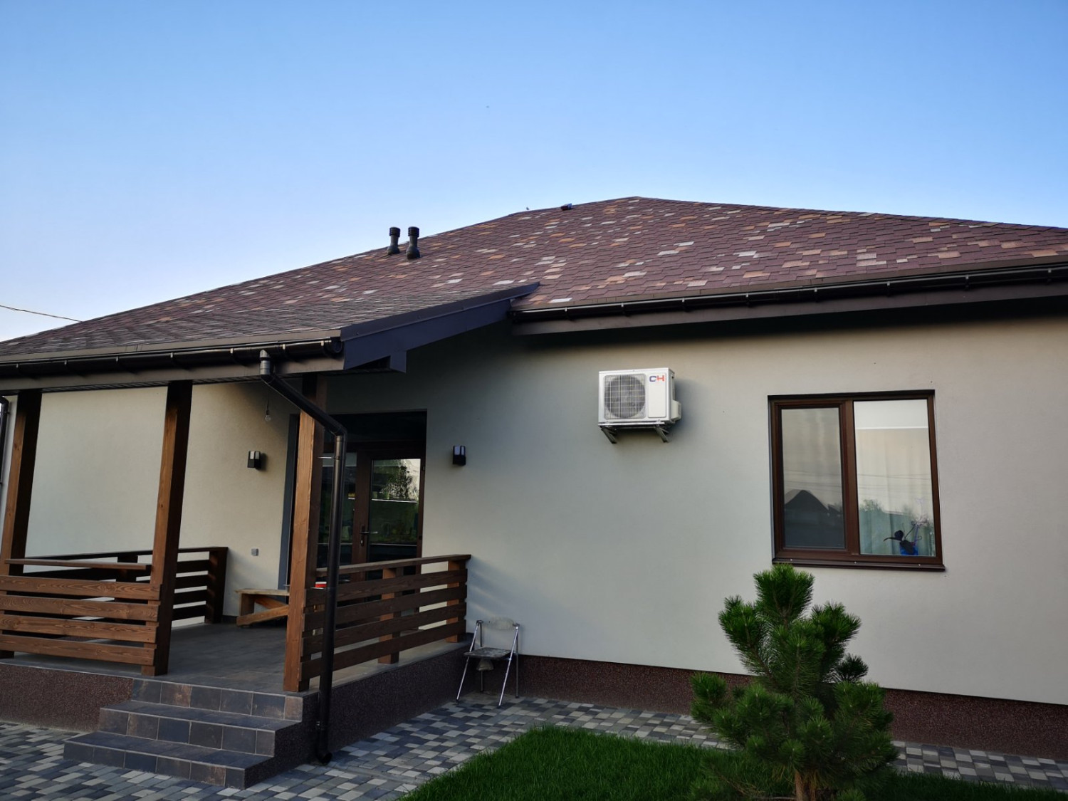 Зовнішні, та внутрішня стіни будинку з газобетонних блоків товщиною 375 мм, клас міцності В 2,5, D 400. Перегородки з газблоків товщиною 100 мм. Перекриття будинку – дерев’яні балки з утепленням мінватою 350 мм. Покрівля чотирьохскатна. Покрівельне покриття-бітумна черепиця.