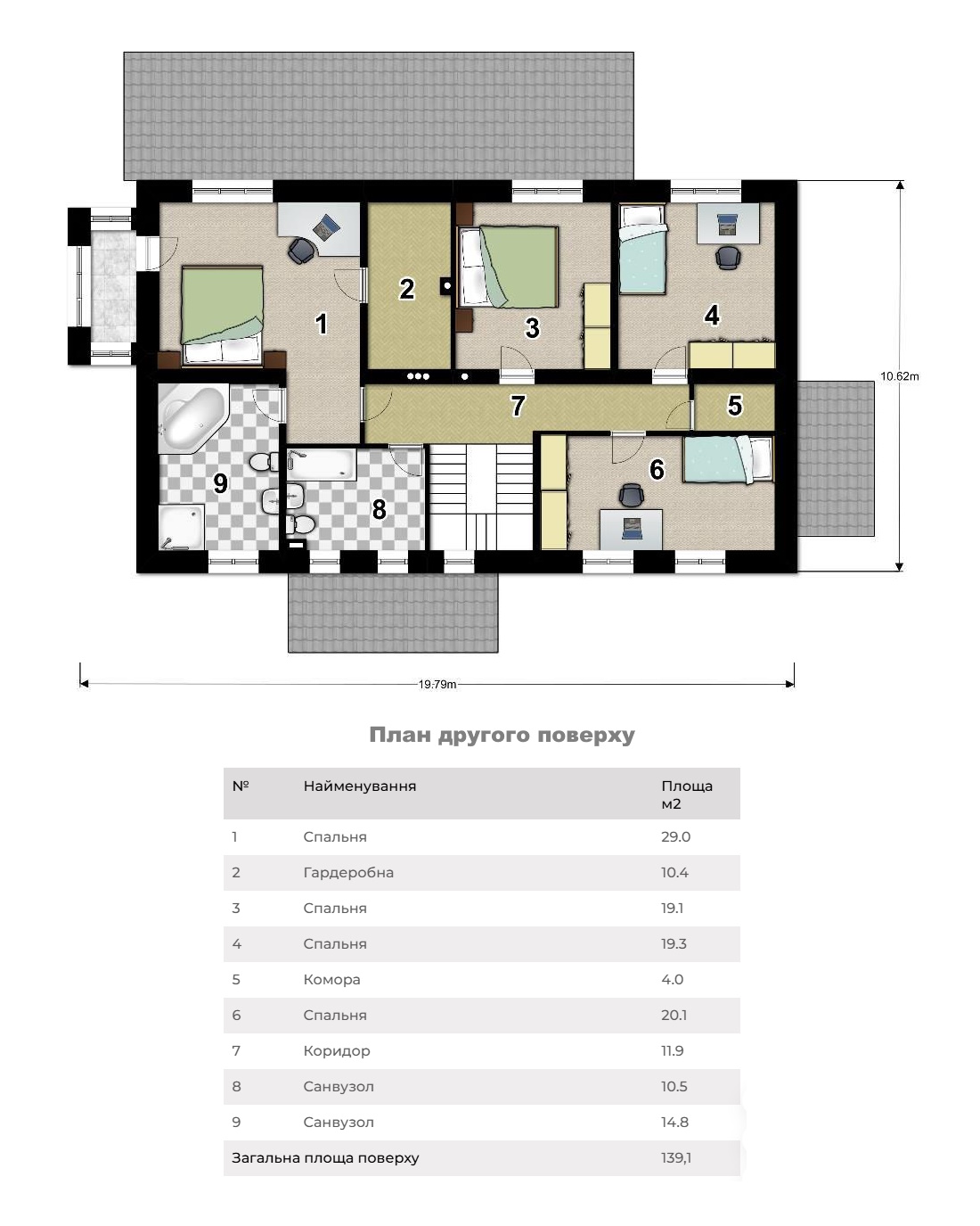 - Покрівельне покриття: Бітумна черепиця.