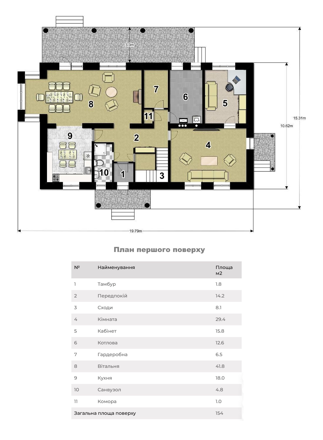 - Габарити будинку з ганком та терасою: 19.8 м х 15.3 м